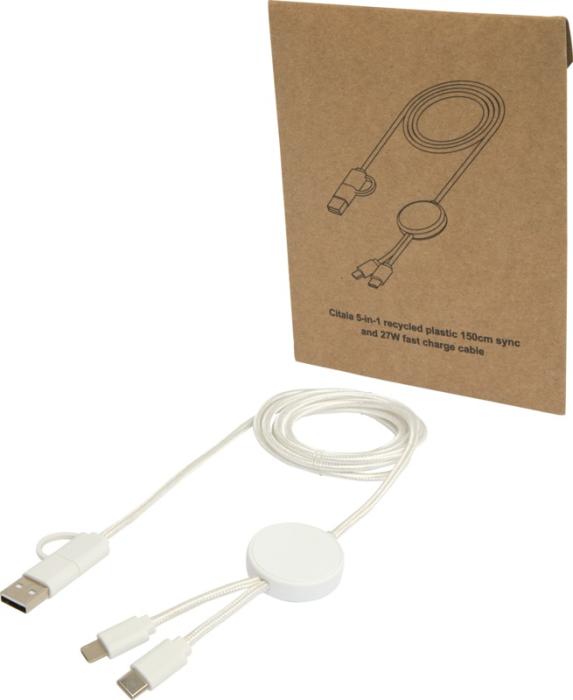Le câble 5-en-1 Citala en plastique recyclé permet de charger vos appareils et de synchroniser vos données facilement. Il intègre des connecteurs USB-A et Type-C en entrée, ainsi qu’une sortie Type-C et Lightning/Micro USB. De plus, il prend en charge la charge rapide jusqu’à 27 W. Compact et pratique, il s’utilise à la maison, au bureau ou en déplacement.