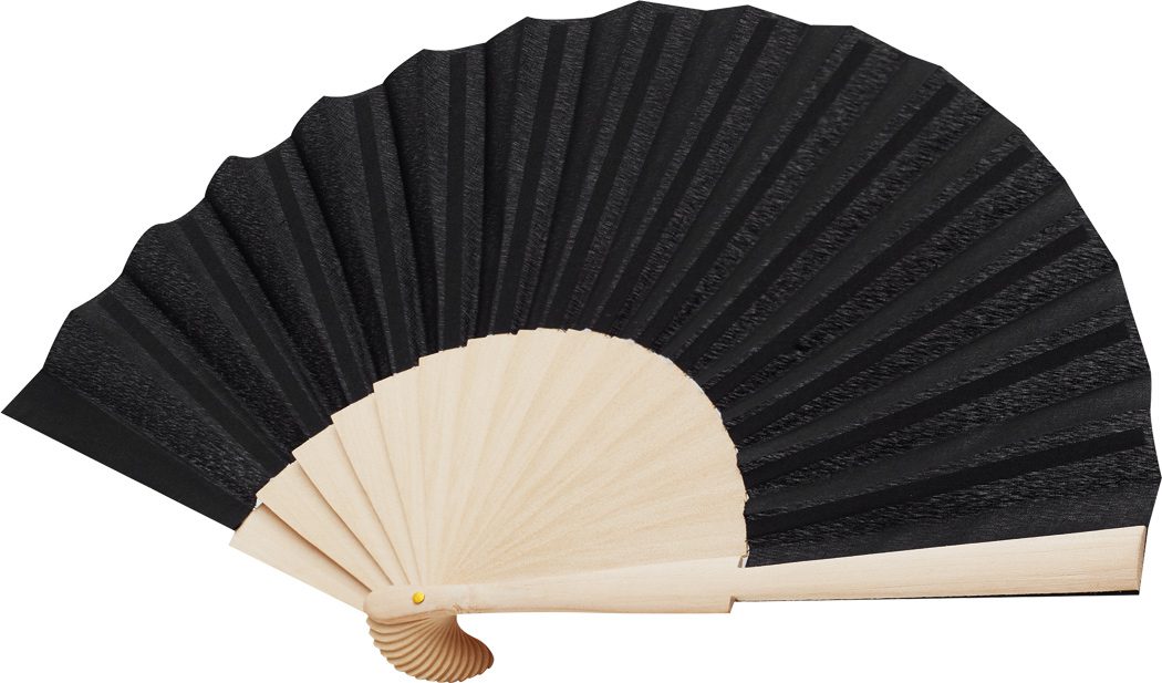 Éventail pliable : Doté d’une poignée en bois robuste et de bâtonnets en bois résistants, cet éventail est recouvert de polyester recyclé pour une durabilité accrue.