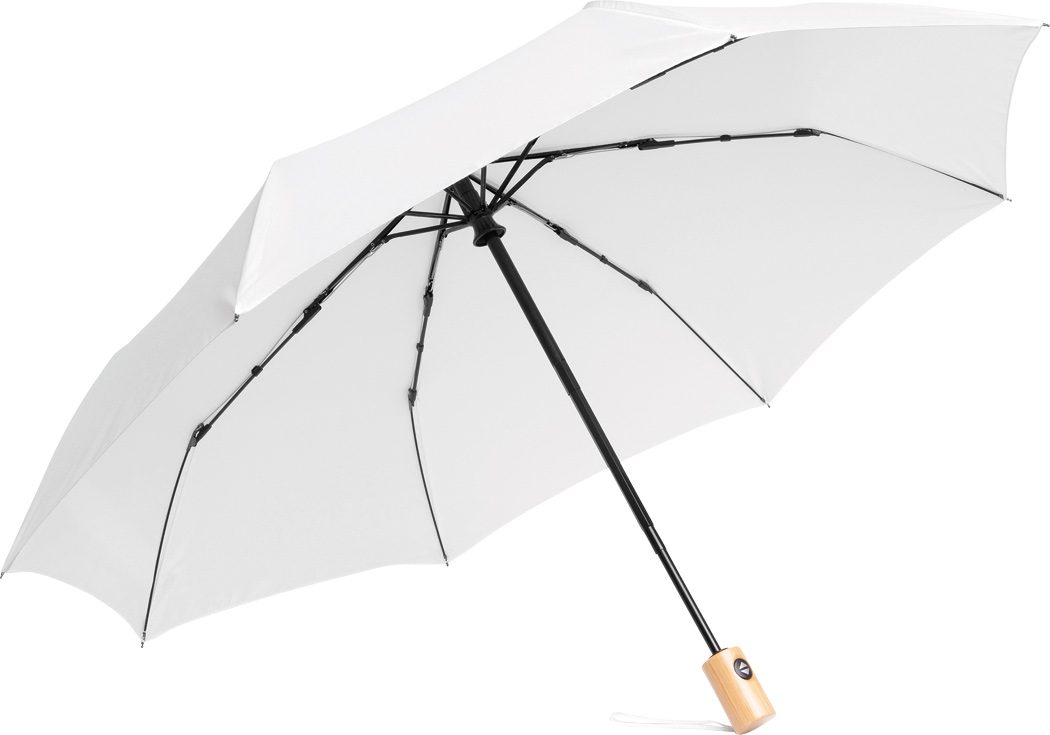Parapluie pliable automatique tempête avec étui assorti : Ce parapluie dispose d’un manche en 3 parties, des baleines en fibre de verre ou en métal-plastique, et des embouts métalliques. Sa poignée en bambou est munie d’une dragonne pratique. Son revêtement est fait en polyester pongée, utilisant des matériaux recyclés en plastique. Il se ferme à l’aide d’un lacet de fermeture équipé d’un velcro. Dimensions : Ø97 / 28,5-55 cm.
