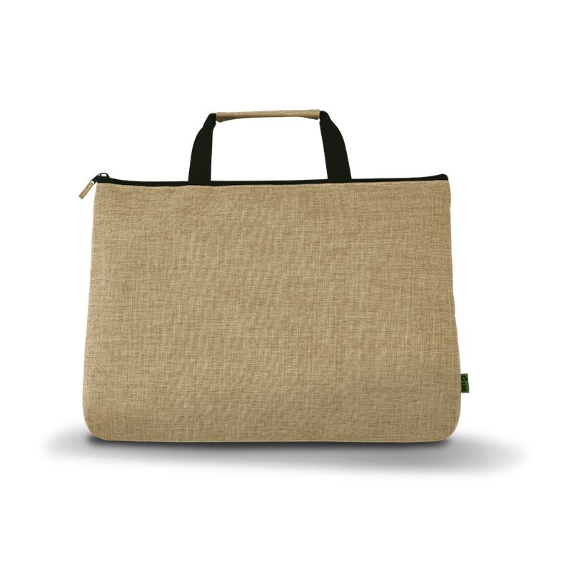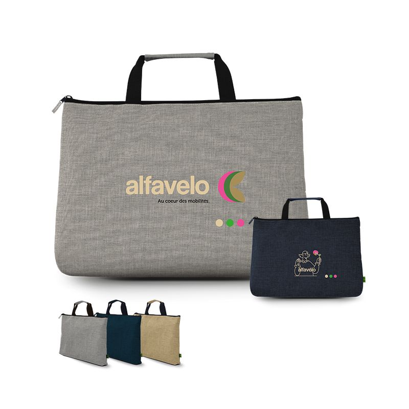 Porte-document en rPET (PET recyclé) avec poche zippée et deux poignées. Écologique, marquage 1 couleur argent recommandé ou quadri-transfert. Dimensions : 410 mm x 290 mm.