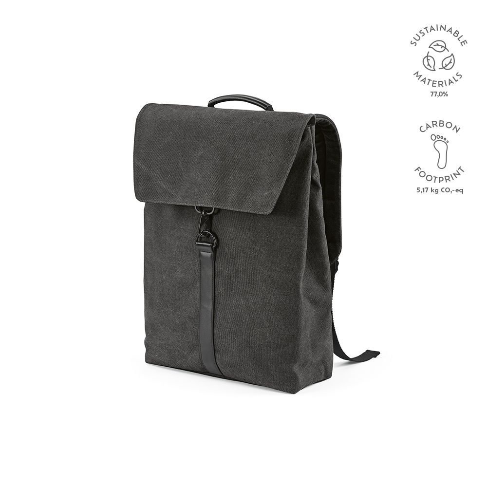 Alliant élégance et fonctionnalité, notre sac à dos de 25 litres marie harmonieusement le coton recyclé avec des détails en PU recyclé. Il est conçu pour accueillir un ordinateur portable de 17 pouces, sécurisé par un cadenas en métal. Avec un rembourrage au niveau du dos et des bretelles, le haut se ferme facilement grâce à des boutons clic-clac. Il est livré dans un sac individuel composé de 70 % de coton recyclé et 30 % de rPET.
