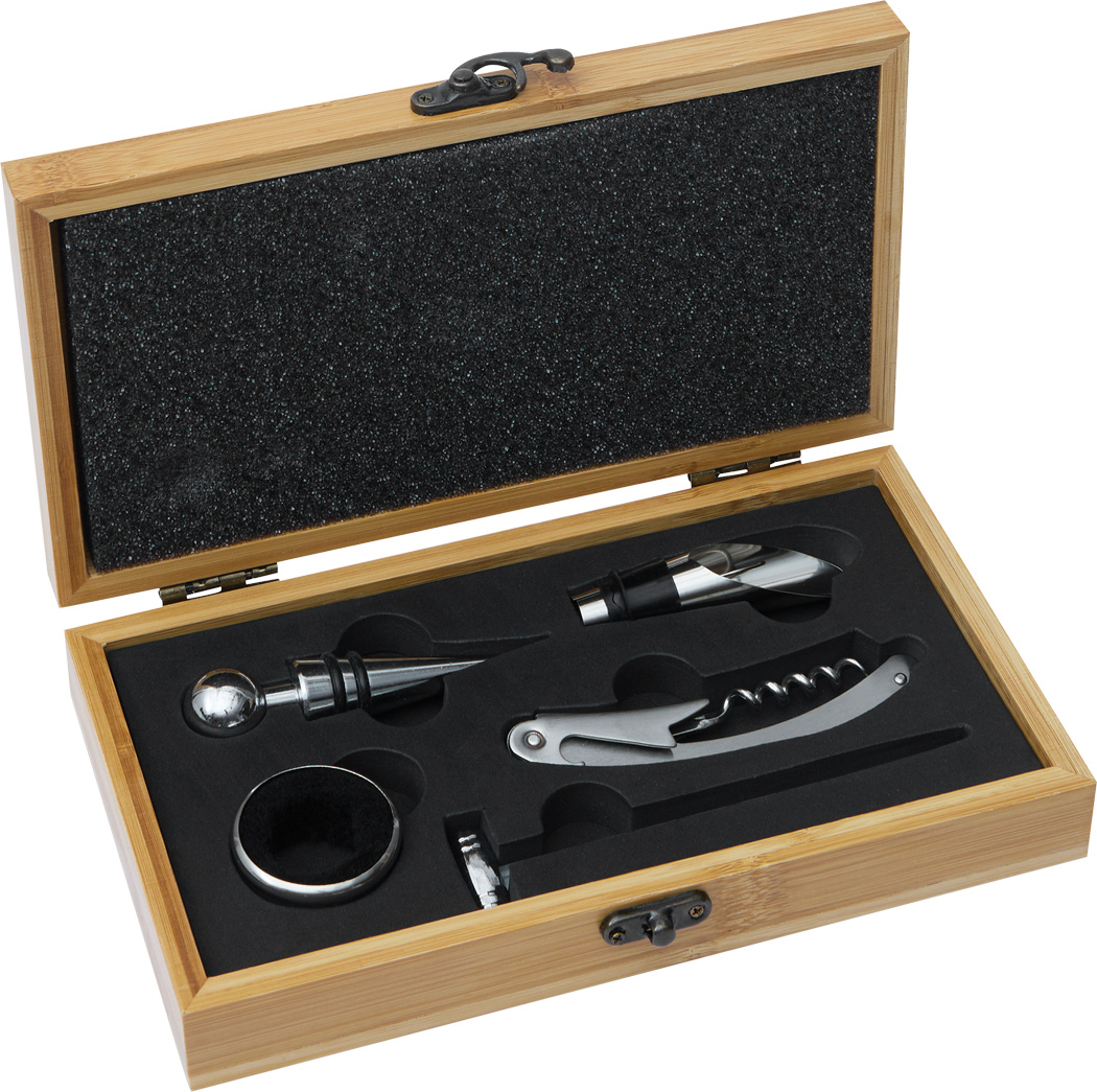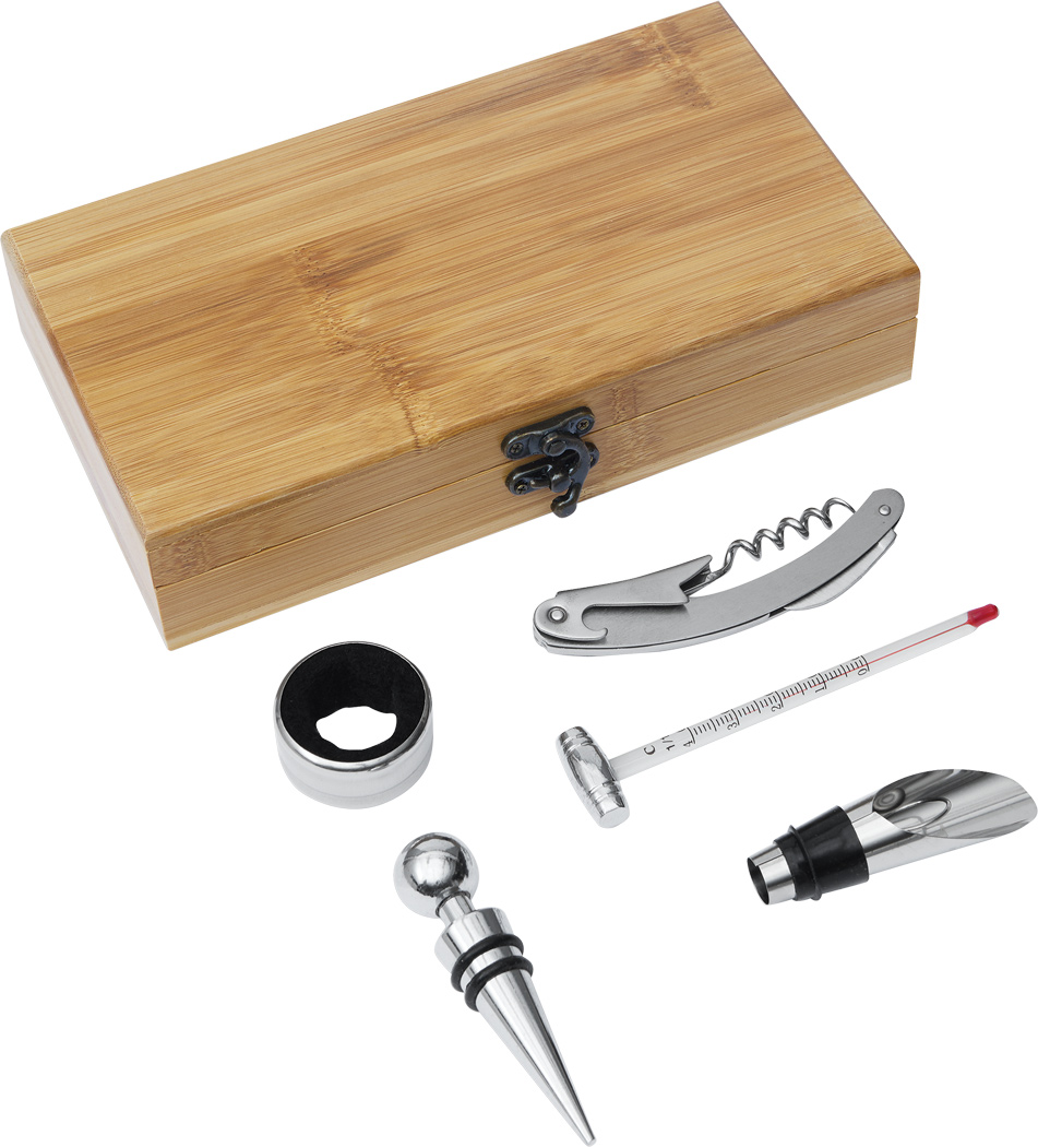 Élégant service à vin présenté dans une boîte en bambou naturel, ce coffret réunit tous les accessoires indispensables pour une dégustation raffinée. Il contient un thermomètre à vin en verre pour contrôler la température idéale, une bague anti-goutte en acier inoxydable, un bouchon de bouteille en métal, un embout verseur assorti ainsi qu’un couteau de sommelier en inox. Pratique et esthétique, il allie robustesse et élégance, faisant de lui le cadeau parfait pour les amateurs de vin comme pour un usage personnel.