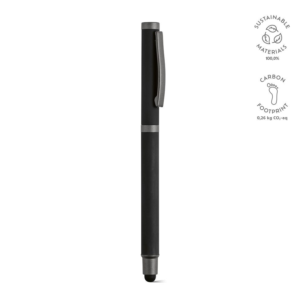 Conçu en acier inoxydable recyclé, ce stylo se distingue par son système à capuchon intégrant une pointe tactile. Il contient 1 kilomètre d’encre noire Dokumental® pour une écriture fluide. Livré dans un élégant étui en bambou, il allie sophistication et durabilité avec une touche naturelle.