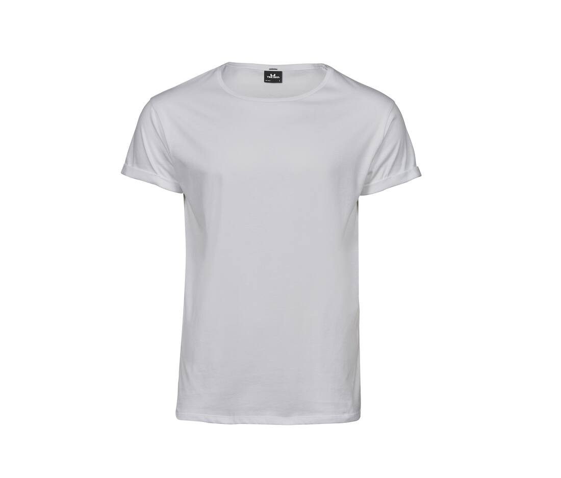 Tee-shirt à manches retroussées avec une coupe décontractée et un décolleté large. Les manches sont retroussables et attachables. 100% coton peigné Ringspun.