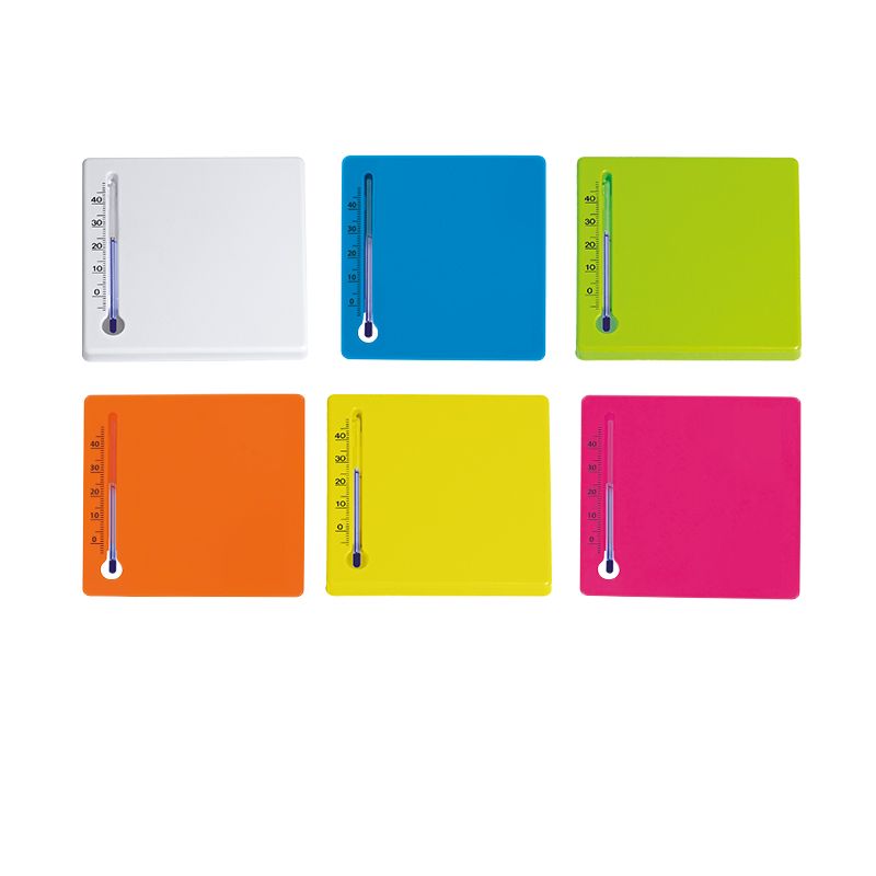 Thermomètre carré en polystyrène choc, pratique pour surveiller la température. Fabriqué en France. Dimensions : 110 mm x 110 mm x 10 mm.
