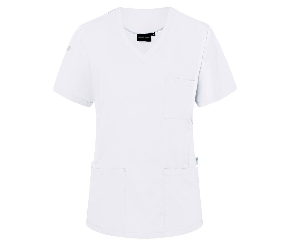 Tunique femme à manches courtes avec un col en V, adaptée notamment aux secteurs de la santé et de la beauté. Elle présente une coupe légèrement ajustée. 65% polyester recyclé certifié/35% coton. OEKO TEX